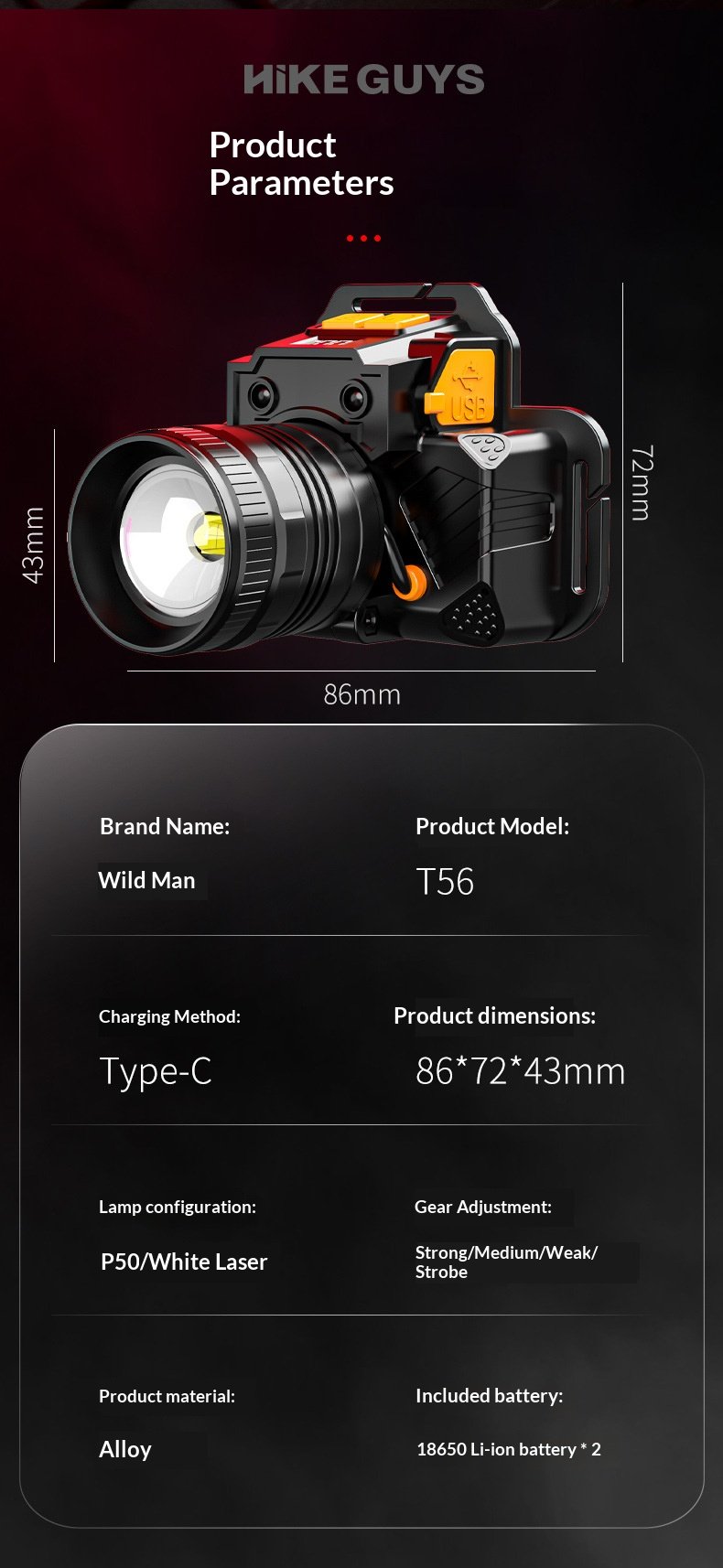 Material: Aluminum alloy - Lithium battery capacity: 18650 lithium battery*2