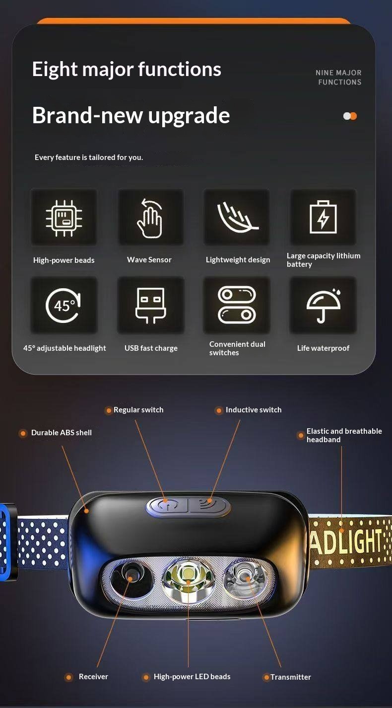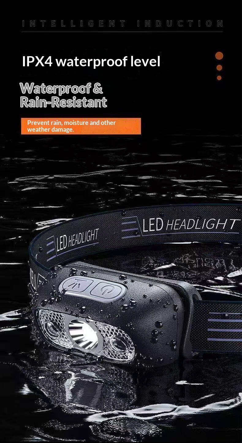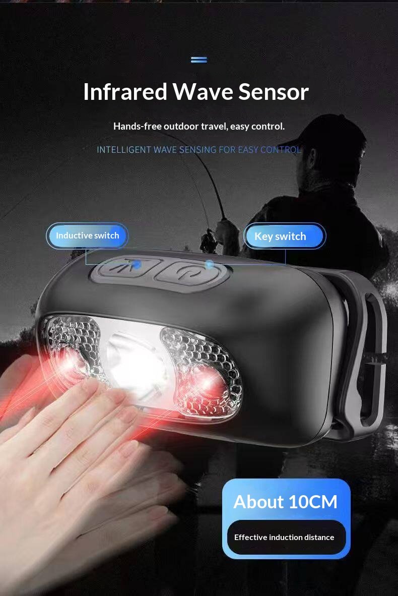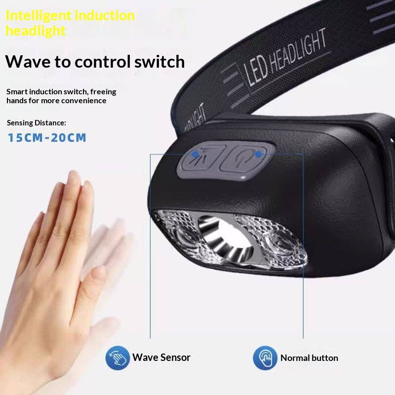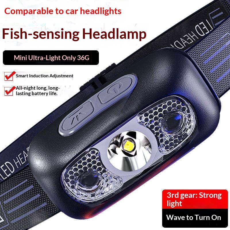 Ultra-bright LED headlamp, rechargeable, head-mounted, high-intensity motion-sensing flashlight; compact, portable night fishing light.
