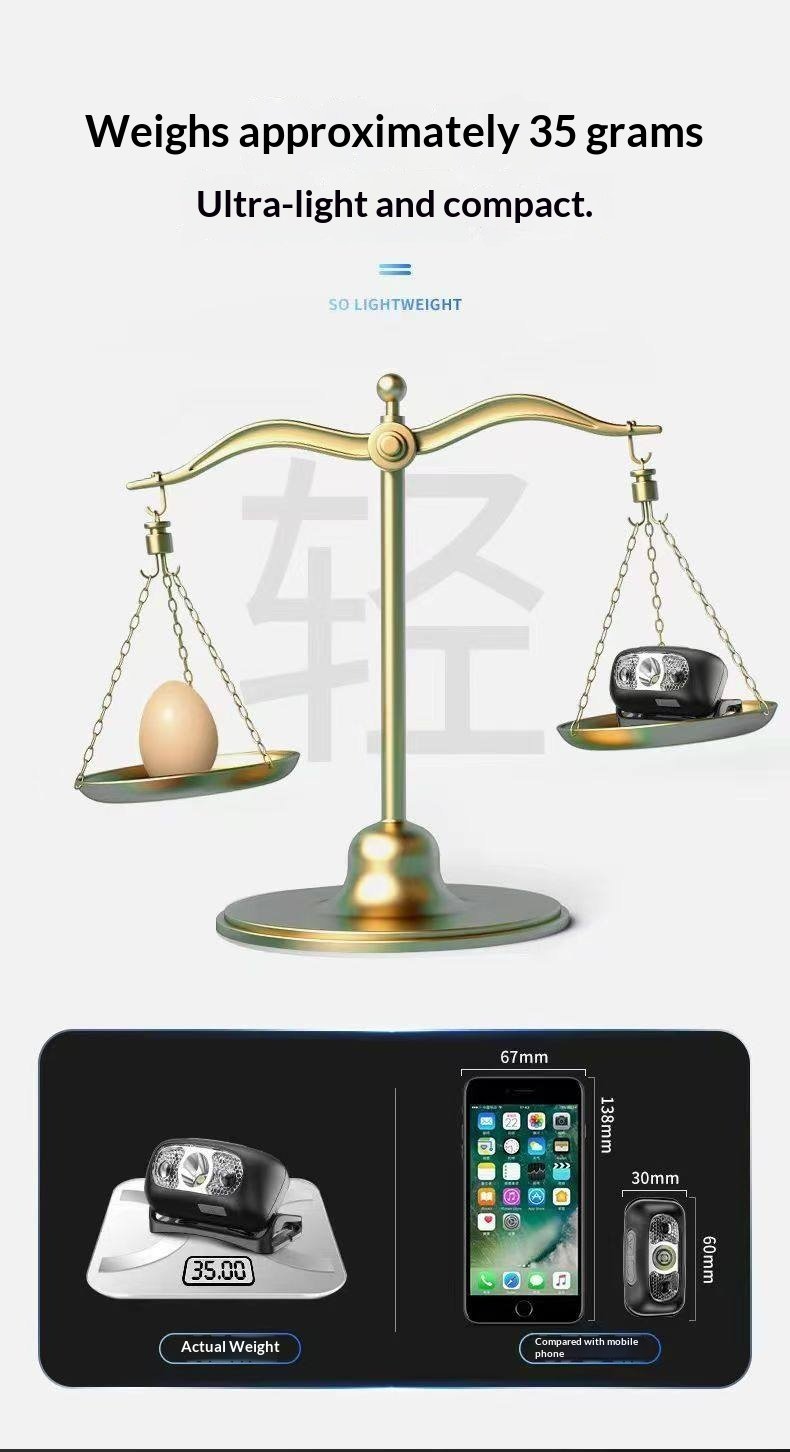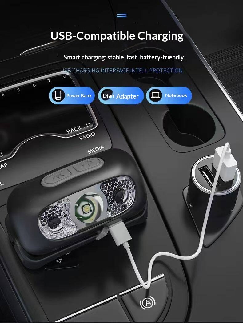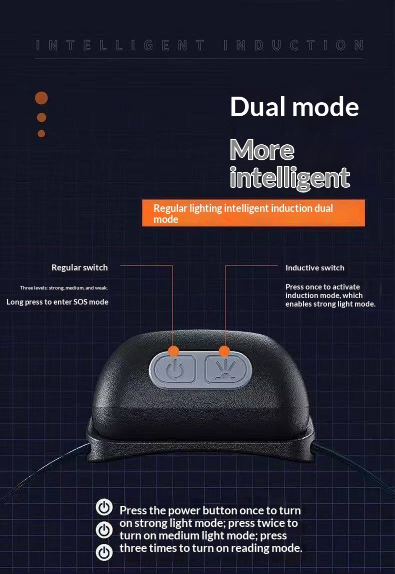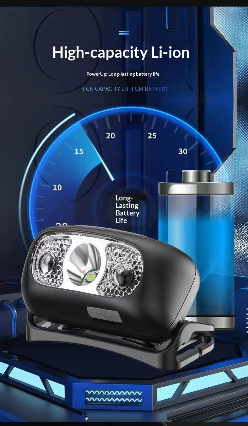 Ultra-bright LED headlamp, rechargeable, head-mounted, high-intensity motion-sensing flashlight; compact, portable night fishing light.