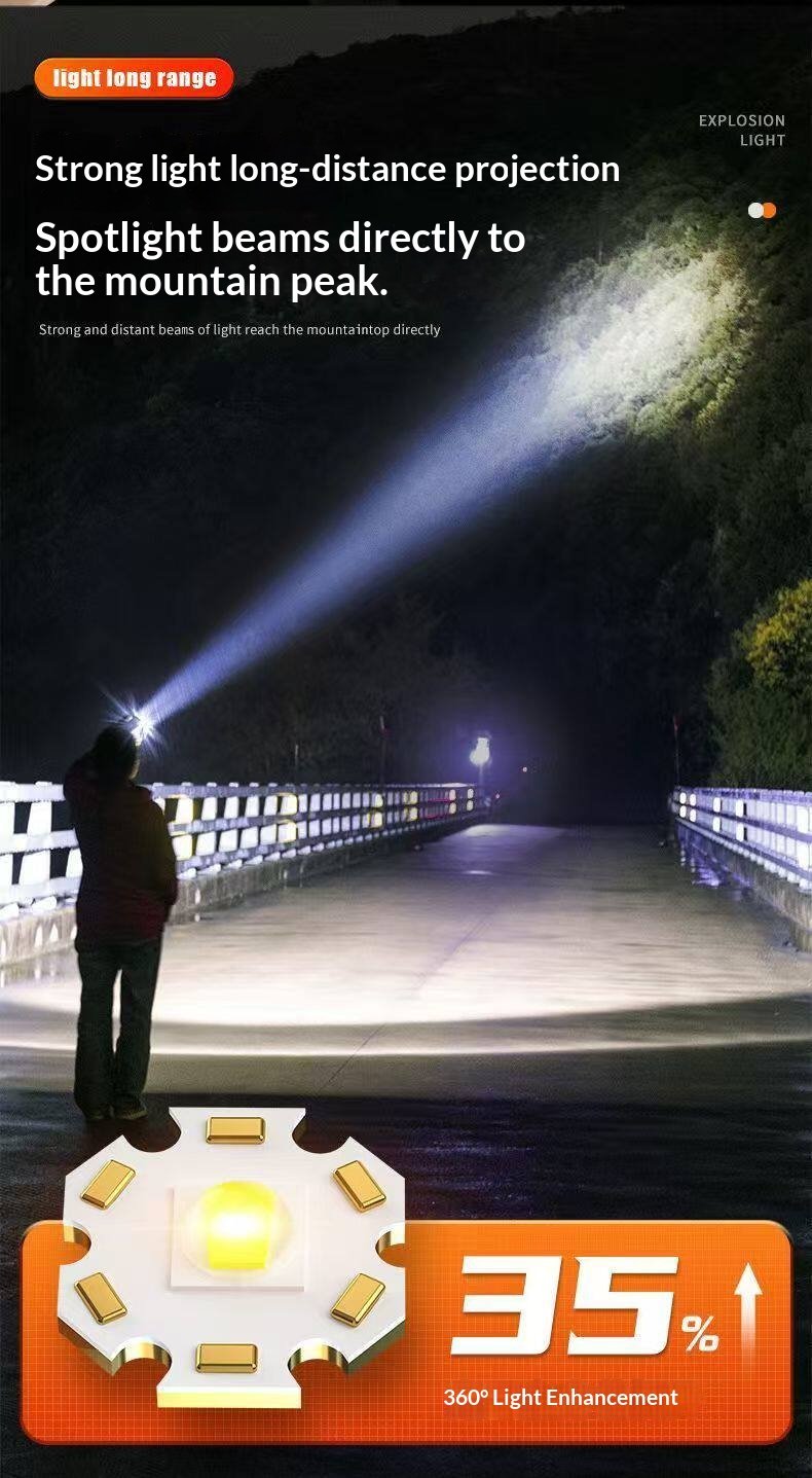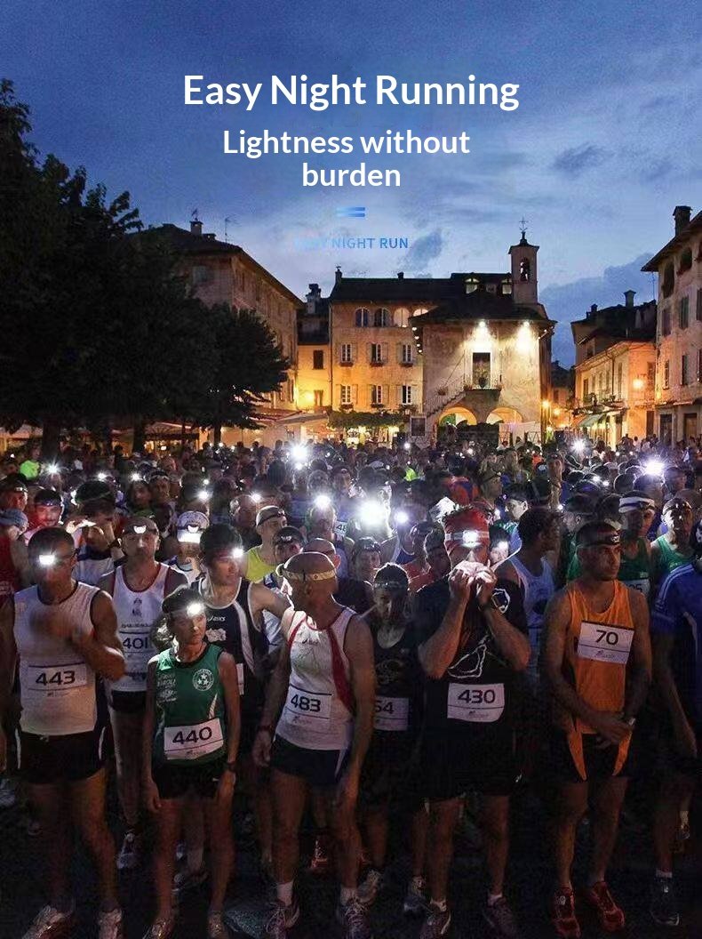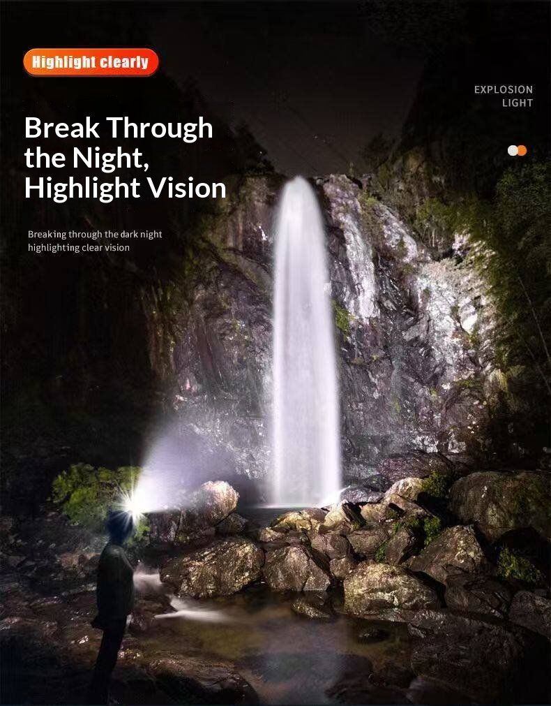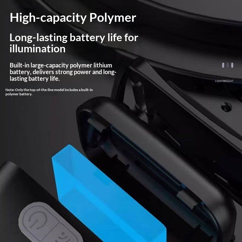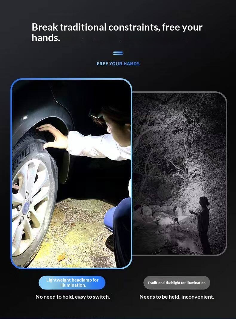 Ultra-bright LED headlamp, rechargeable, head-mounted, high-intensity motion-sensing flashlight; compact, portable night fishing light.